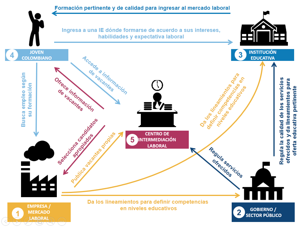 Es decir, este sistema que está compuesto principalmente por el mercado laboral, el sector productivo, el sector educativo, el gobierno nacional y local, entre otros; debe hablar un mismo lenguaje que permita que sus relaciones e interacciones fluyan de forma adecuada. Debe estar articulado y alienado para alcanzar su gran meta: la vinculación laboral de los jóvenes.